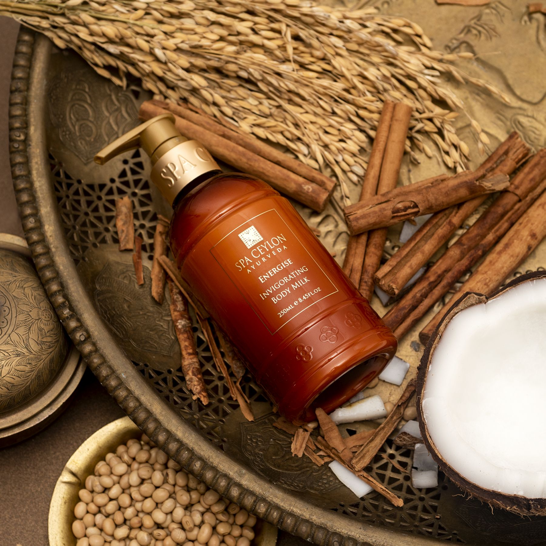 A warming & hydrating blend of powerful Ayurveda herbs & potent essential oils. Organic Ceylon Cinnamon helps invigorate & revive the body & mind, gently easing stress. Refreshing Bergamot promotes clarity & awakens the senses, while precious oriental Patchouli helps uplift & balance the chakras. Virgin Coconut & Ceylon Moringa help nourish & hydrate skin. Wheatgerm & Sweet Almond soften & protect skin against dryness, while Rice Bran helps even-out skin tone & improve visible youthfulness.
