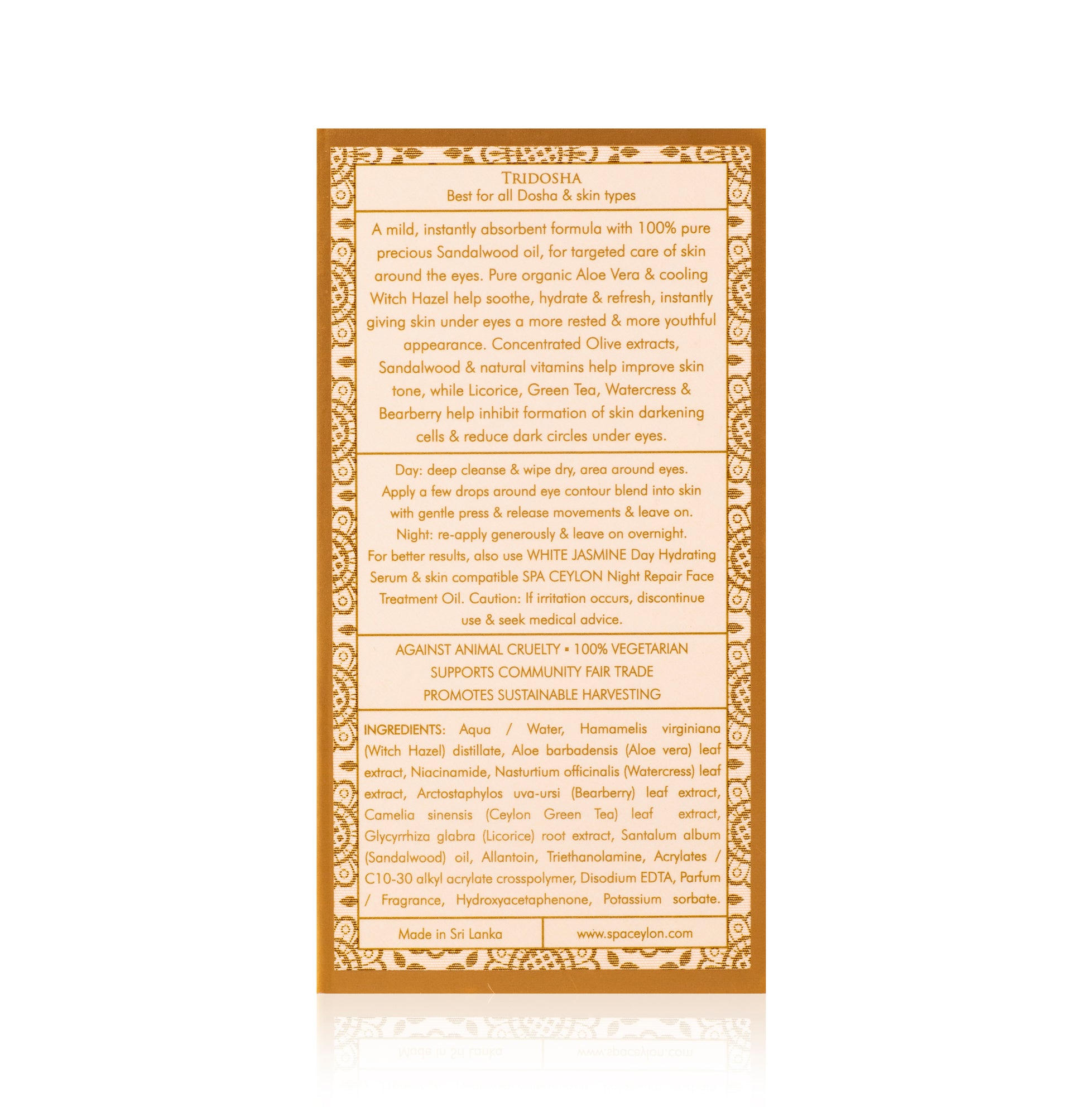 A mild, instantly absorbent formula with 100% pure precious Sandalwood oil, for targeted care of skin around the eyes. Pure organic Aloe Vera & cooling Witch Hazel help soothe, hydrate & refresh, instantly giving skin under eyes a more rested & more youthful appearance. Concentrated Olive extracts, Sandalwood & natural vitamins help improve skin tone, while Licorice, Green Tea, Watercress & Bearberry help inhibit formation of skin darkening cells & reduce dark circles under eyes.